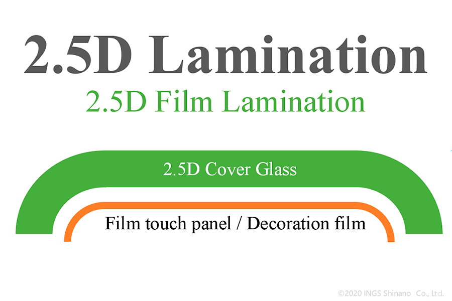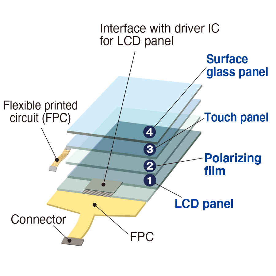 - Laminating of cover glass and touch panel(Right figure: 3 and 4) Both film and glass can be laminated together.