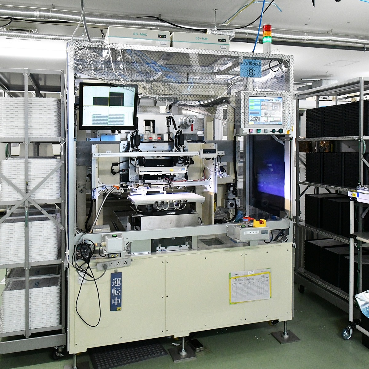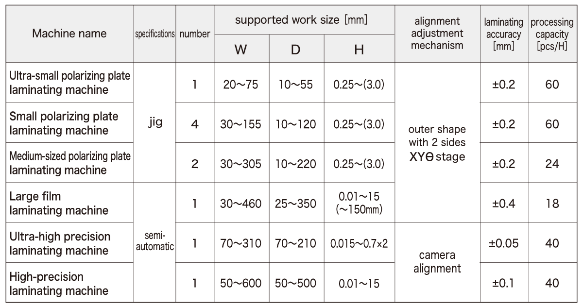 We have a track record of supporting high-precision polarizing plate laminate to panels, film laminate to glass, direct laminating (OCA method / OCR method), and film-to-film laminating.