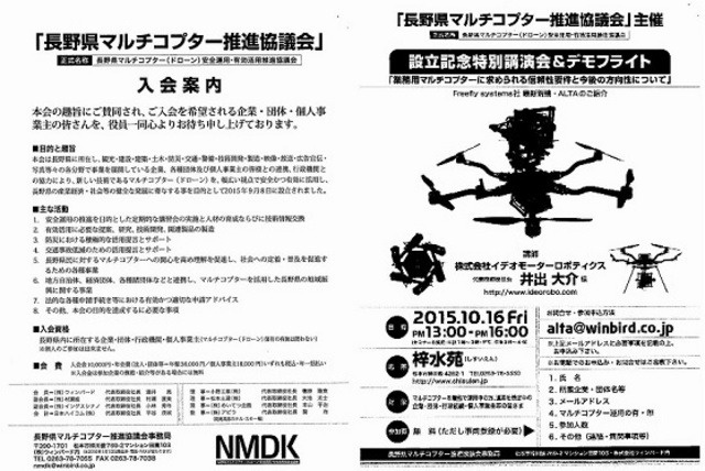 「長野県マルチコプター推進協議会」のご入会案内と「設立記念特別講演会&デモフライト」のお誘いです。ご興味があれば、よろしくお願いいたします。