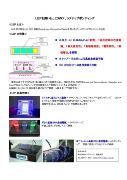 2014年04月09日(水) LEPを用いたLEDのフリップチップボンディング 開発元のデクセリアルズ(株)殿からの技術提供により、LED用に特化したACP材料『LEP』による、フリップチップ実装試作の対応を開始いたしました。 お客様におけるLEP技術導入前の試作ご評価、少量生産に是非ご活用下さい。 ※フリップチップタイプのLEDベアダイの調達も可能です。