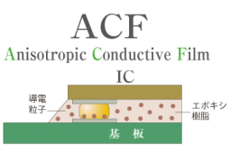 ACF(=異方性導電フィルム)は、Anisotropic Conductive Film の略で、熱硬化性のエポキシ樹脂の中に導電性粒子を分散させた封止樹脂です。熱圧着加工により、圧着部における厚み方向に対しては導通性、面方向に対しては絶縁性を保持する電気的異方性を示します。